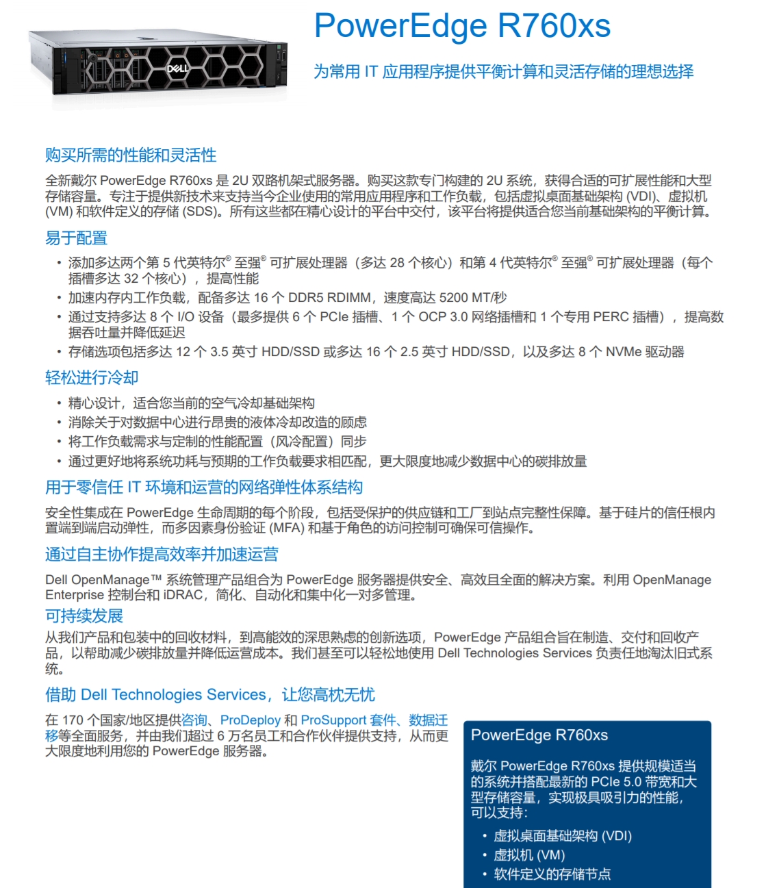 全新戴爾 PowerEdge R760xs 是 2U 雙路機架式服務(wù)器,專注于提供新技術(shù)來支持當(dāng)今企業(yè)使用的常用應(yīng)用程序和工作負(fù)載,包括虛擬桌面基礎(chǔ)架構(gòu) (VDI)、虛擬機(VM)和軟件定義的存儲 (SDS)。所有這些都在精心設(shè)計的平臺中交付,該平臺將提供適合您當(dāng)前基礎(chǔ)架構(gòu)的平衡計算