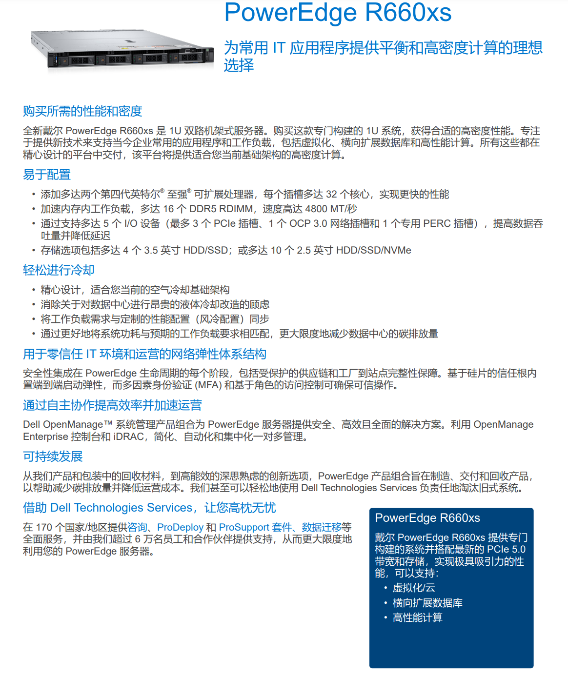 全新戴爾 PowerEdge R660xs 是 1U 雙路機(jī)架式服務(wù)器。購買這款專門構(gòu)建的 1U 系統(tǒng),獲得合適的高密度性能。專注于提供新技術(shù)來支持當(dāng)今企業(yè)常用的應(yīng)用程序和工作負(fù)載,包括虛擬化、橫向擴(kuò)展數(shù)據(jù)庫和高性能計(jì)算。所有這些都在精心設(shè)計(jì)的平臺(tái)中交付,該平臺(tái)將提供適合您當(dāng)前基礎(chǔ)架構(gòu)的高密度計(jì)算。